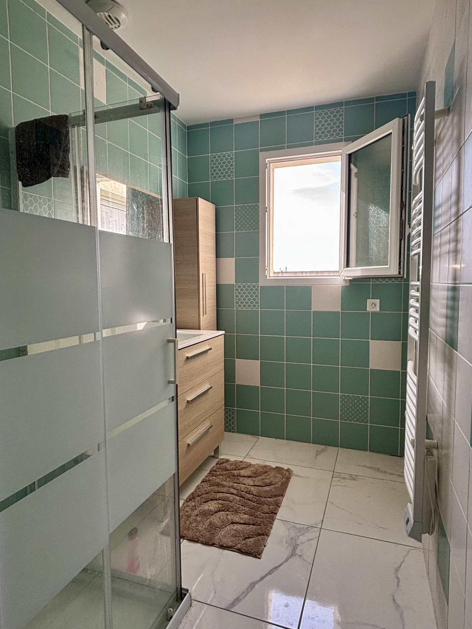 Côté confort : chauffage au sol par pompe à chaleur, volets roulants motorisés, construction récente.