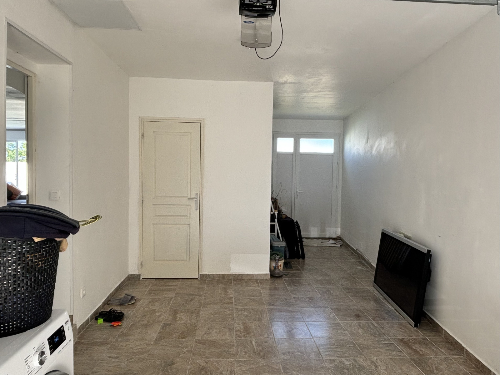 Le garage isolé et carrelé de 22 m², équipé d’une porte sectionnelle motorisée, donne accès direct à une buanderie et au jardin situé à l'arrière.