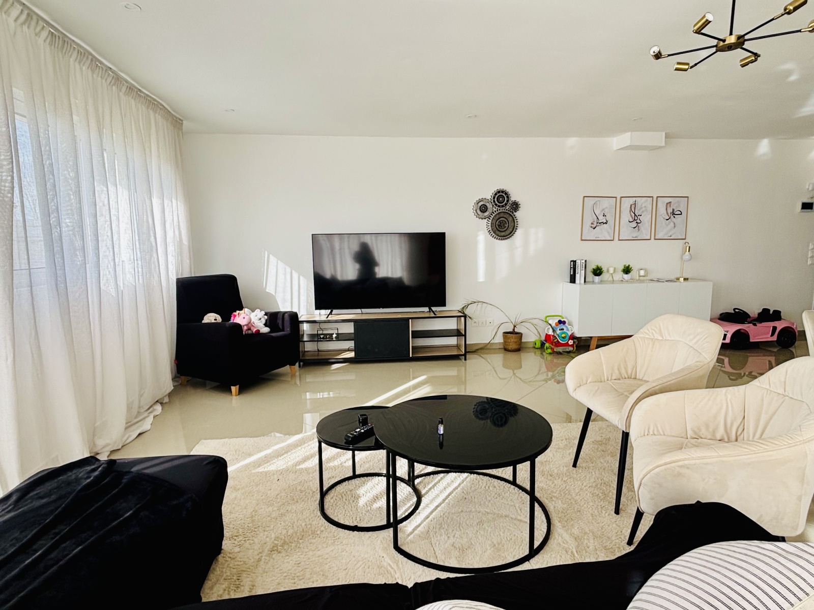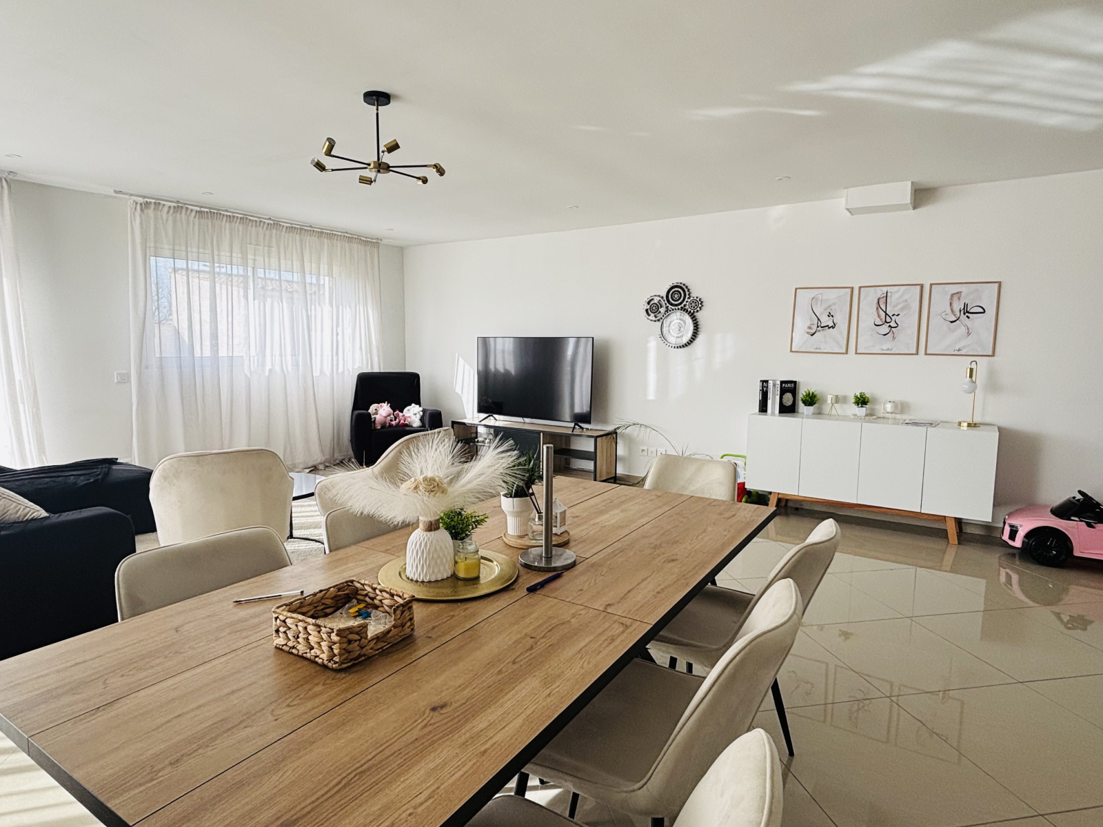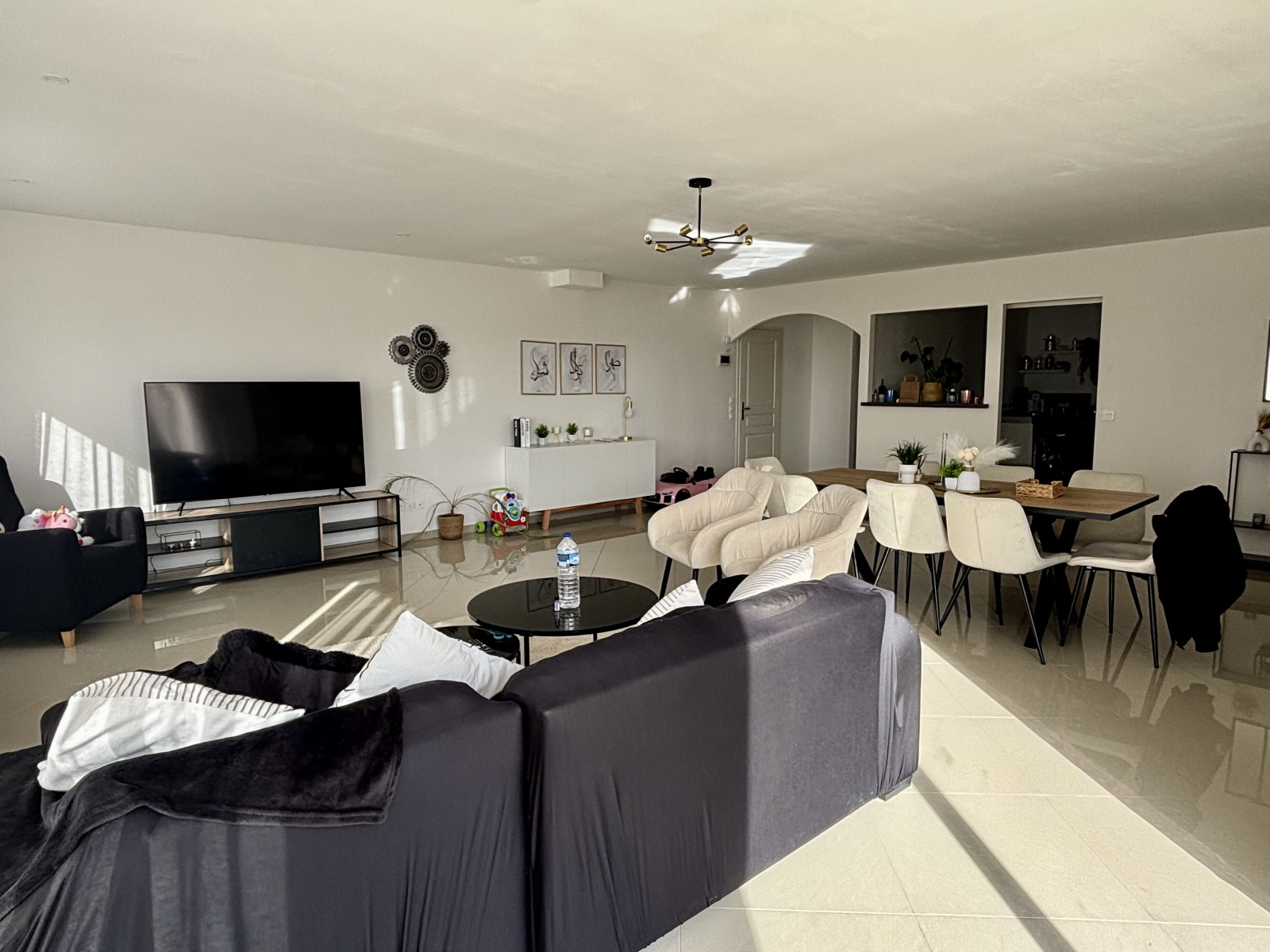 D’une superficie de 129 m², elle se compose d’une entrée avec placard, d’un vaste séjour-salon lumineux de 55 m², orienté sud-ouest, et d’une cuisine aménagée et équipée avec coin repas.
